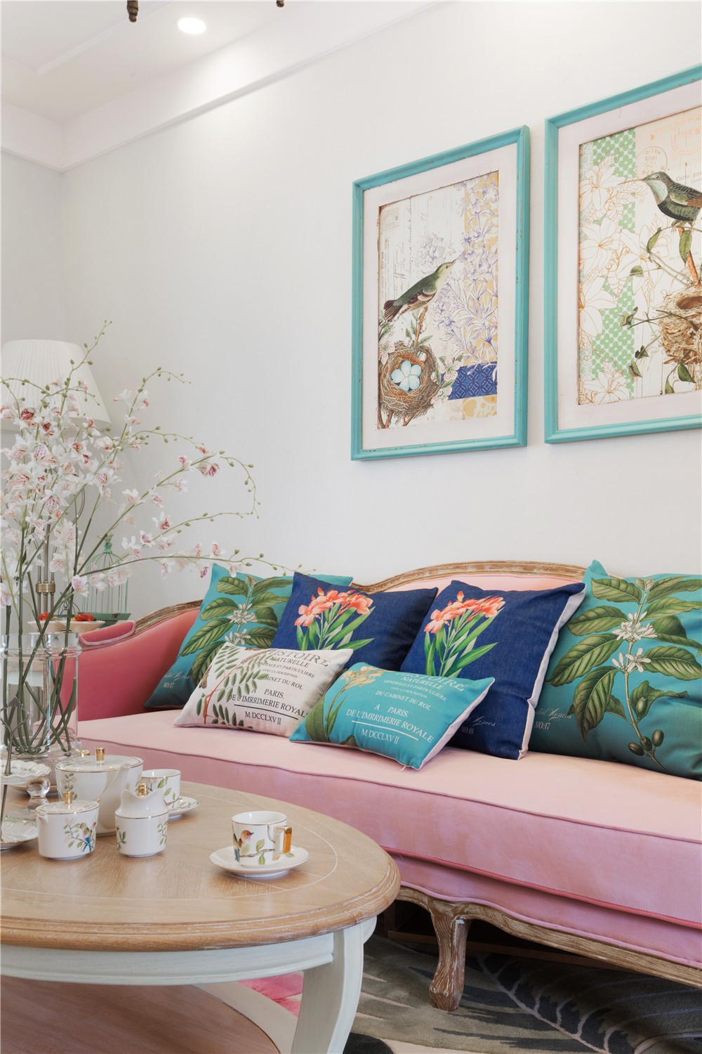 室內(nèi)客廳裝修效果圖,整個客廳選擇了簡歐簡潔,選線條圓潤,色彩豐富,用了自然綠和深藍來緩沖粉色沙發(fā)的跳躍感。