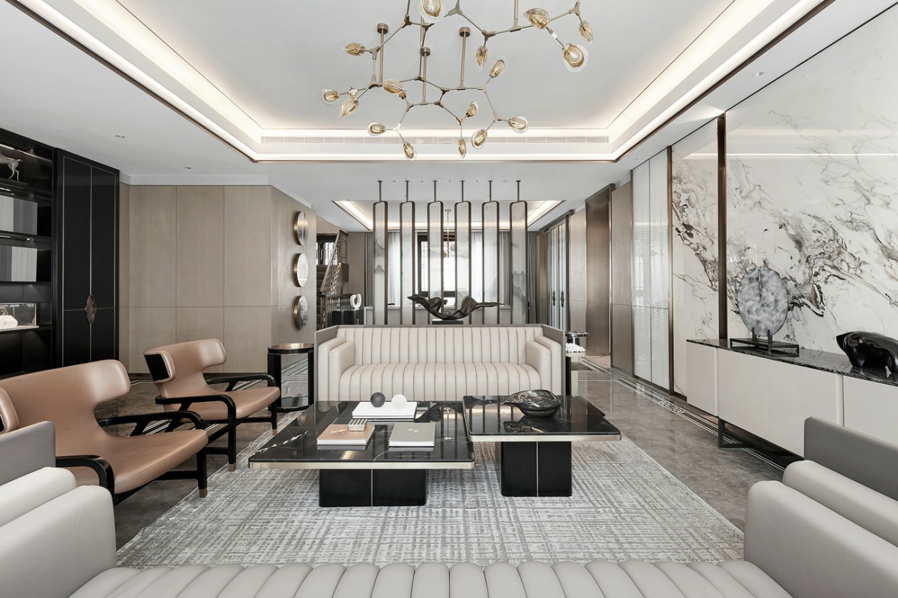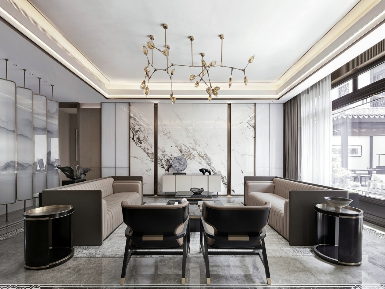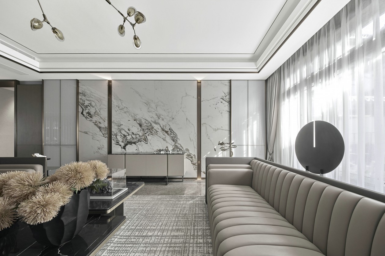 陽光透過輕紗,從庭院外灑滿整個客廳。質(zhì)感細(xì)膩的大白花大理石將山色湖光的片刻靈動擲于墻上,搭配地面宛若水波般機理延綿的意大利灰大理石,以及氣質(zhì)清傲的啞光質(zhì)感染色銀檀木,一幅融合了現(xiàn)代皴法的寫意山水,在客廳悄然渲染而開。置身其間,悠然畫上,時而獨自清凈,時而天倫之樂。落地窗外,庭景依舊,四季螺旋更迭。