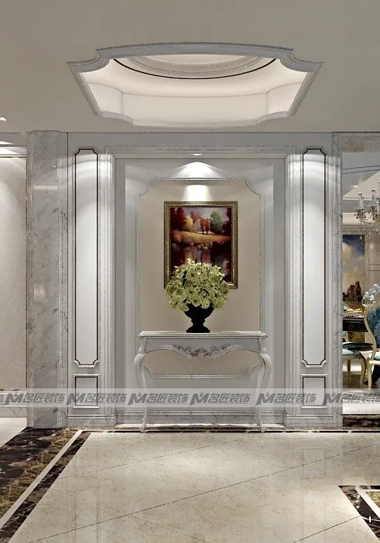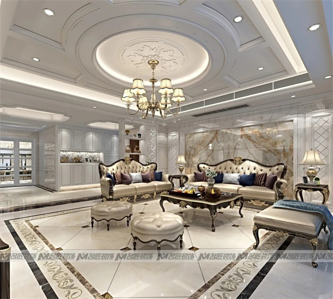 花紋對(duì)稱(chēng)的金色大理石沙發(fā)墻面,線條對(duì)稱(chēng)的白色窄框石膏線,以及復(fù)古的臺(tái)燈、擺飾,都展現(xiàn)出空間的規(guī)律美感,在視覺(jué)上達(dá)到平衡。造型古典的彎腿式沙發(fā),華麗的吊燈,精美的雕花鏤空隔斷,別致的拼花地磚,塑造出高貴典雅從容的居住空間。
