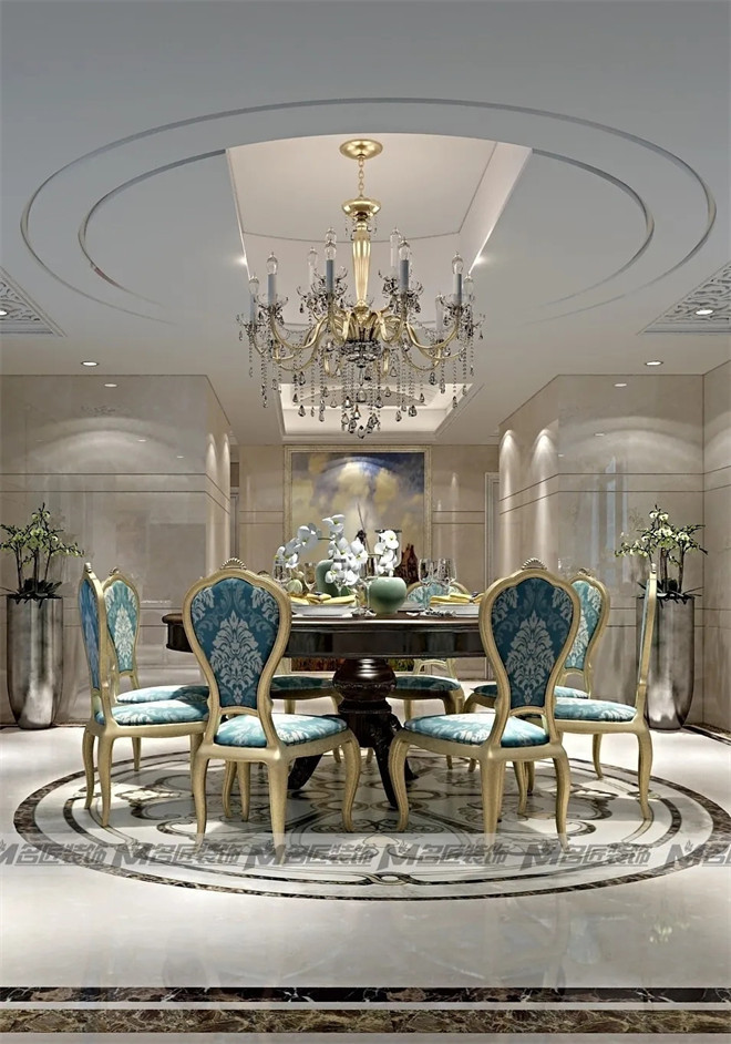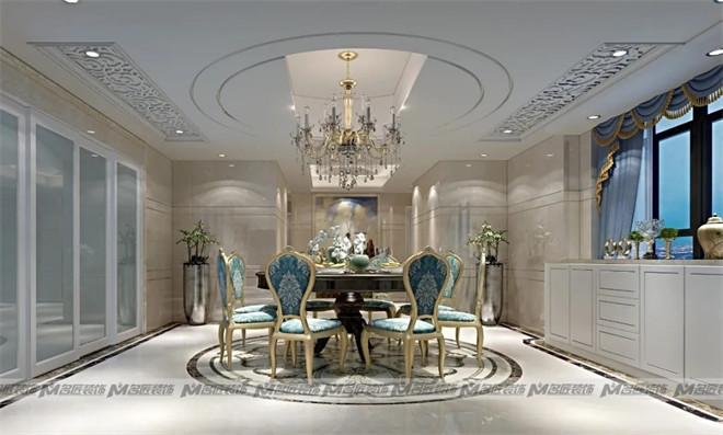湖綠色復(fù)古花紋的餐桌椅儼然是餐廳的主角,優(yōu)雅氣派,明亮璀璨的水晶吊燈烘托出浪漫溫馨的用餐氛圍,天花板的極簡(jiǎn)圓形線條與雕花線條相輔相成,在裝飾上盡顯華麗!