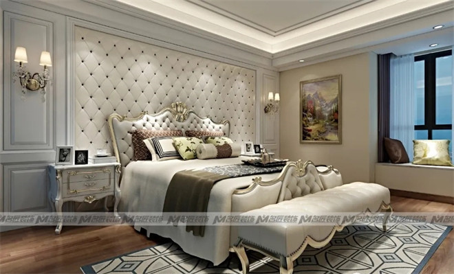 簡(jiǎn)歐風(fēng)格的主臥在高貴典雅的外表下,溫暖的情調(diào)在慢慢地散發(fā)開(kāi)來(lái)。米白色的菱形軟包背景墻與床頭設(shè)計(jì)一致,起到裝飾作用的同時(shí),