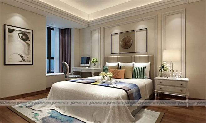 臥室整體色彩靜謐沉穩(wěn),延續(xù)米白色的主色調(diào),搭配棕色的木質(zhì)地板、藍(lán)白相間的幾何圖案地毯,象牙白色的床頭柜,黃銅金屬色的壁燈及油畫(huà),從整體到局部,都給予人更深印象的層次感。