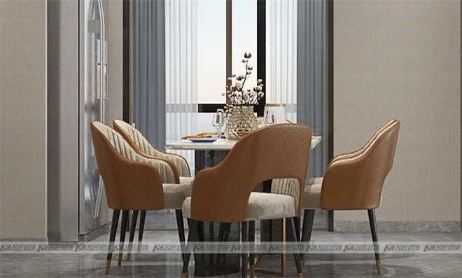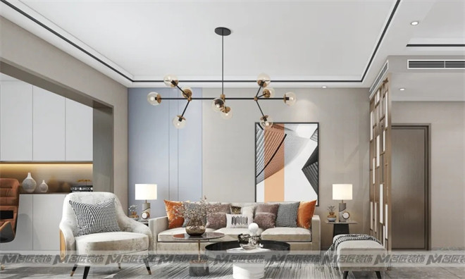 大理石電視背景墻,絲絨質(zhì)地的沙發(fā),輔以窗簾、幾何掛畫(huà)、圓形邊幾、擺件等軟裝搭配,不同材質(zhì)之間相互碰撞,又相輔相成,畫(huà)面一派和諧。