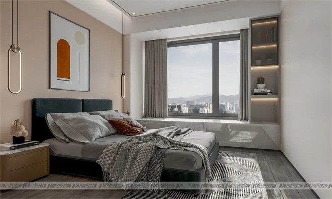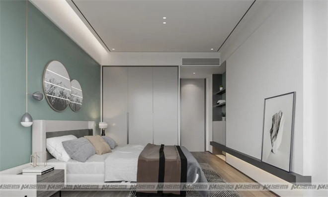 主臥的基調(diào)設(shè)計(jì)打破固化的審美觀,采用清新治愈的馬卡龍綠色作為床頭背景墻顏色,鋪上灰色木地板,裝點(diǎn)色彩和諧的吊燈、印象畫、掛畫等軟裝元素,鑲嵌上些許金邊,凸顯輕奢之美,簡(jiǎn)潔而浪漫,這是心動(dòng)的感覺(jué)!