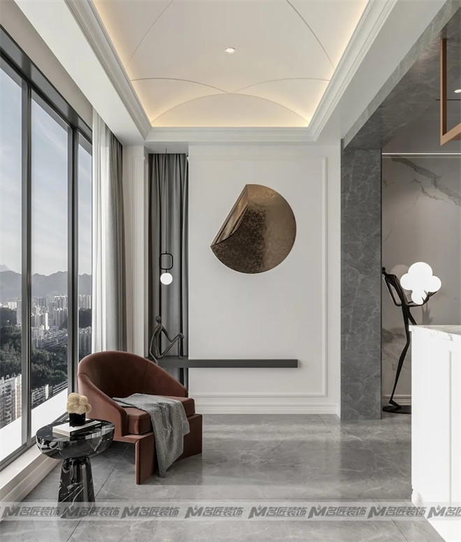 高級(jí)感的玄關(guān)設(shè)計(jì),以白色和灰色作為主要基調(diào),利用富有創(chuàng)意的金屬掛件及黑色抽象雕塑豐富空間,在極簡(jiǎn)的吊燈襯托之下描摹出優(yōu)雅的格調(diào)。