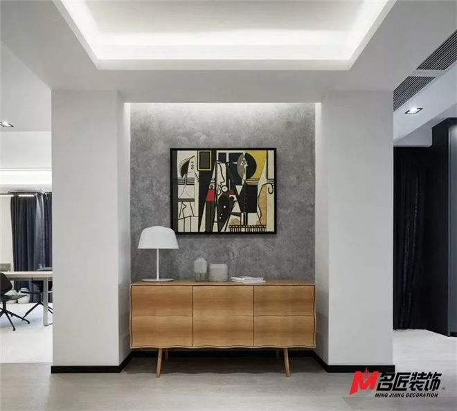 玄關(guān)作為一個(gè)出門與回家的緩沖地帶,設(shè)計(jì)策略上更注重塑造居家性能,充分滿足了居者整理儀容裝束,更換衣服鞋帽的使用需求,又要達(dá)到美觀的效果木質(zhì)的點(diǎn)綴。