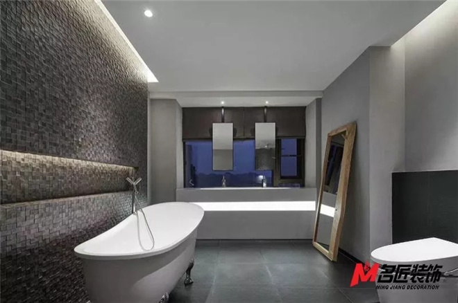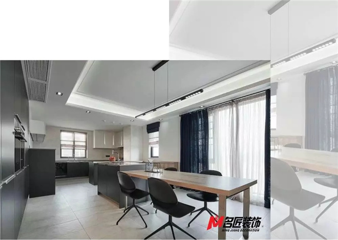 餐廳便是一張簡(jiǎn)單的木餐桌,吊燈的造型、天花的設(shè)計(jì),以及整個(gè)空間黑灰調(diào)的配色,都貫穿了極簡(jiǎn)主義