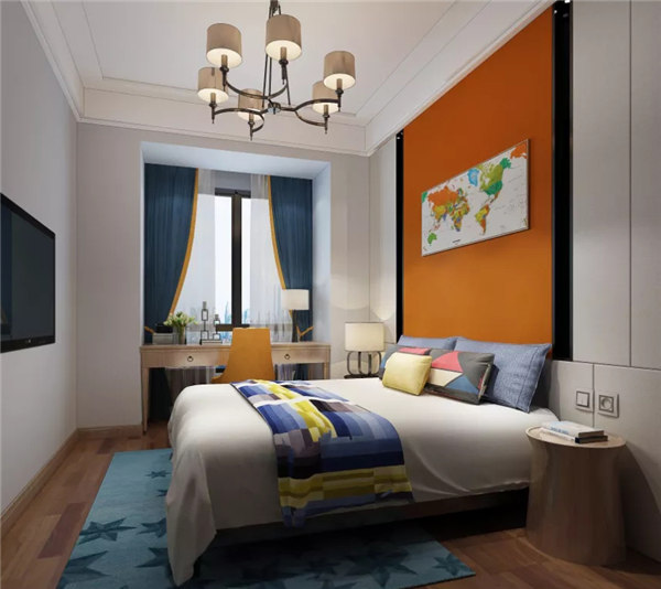 小孩房靠窗戶設置書桌,光線充足;整體以白色調(diào)為主,搭配橙色背景墻與深藍色窗簾,讓空間更有活力。