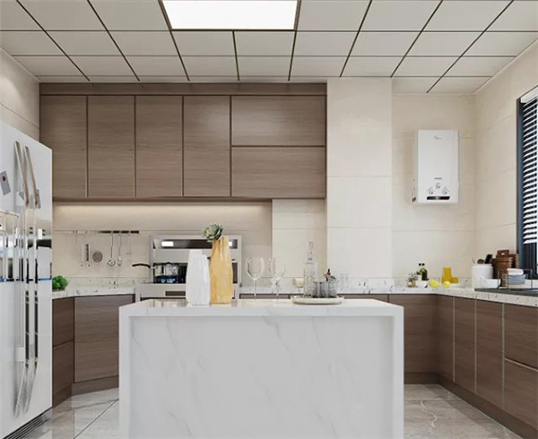 采用硬朗簡潔的直線條,使空間具有層次感;家具顏色以深色為主,蘊含深厚沉穩(wěn)的底蘊,搭配木質櫥柜與大理石石紋瓷磚,呈現(xiàn)出簡雅低沉的氣質,整體設計兼具觀賞與實用性。