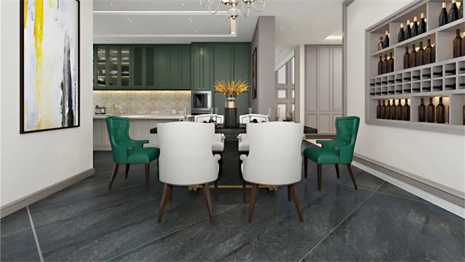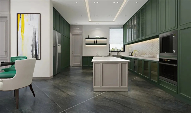 開放式廚房大面積運(yùn)用墨綠色,與客餐的軟裝搭配好不違和,讓空間氛圍更加多元化,摒棄了過多的約束,擺脫了沉悶的裝修格局,讓空間更加開放。