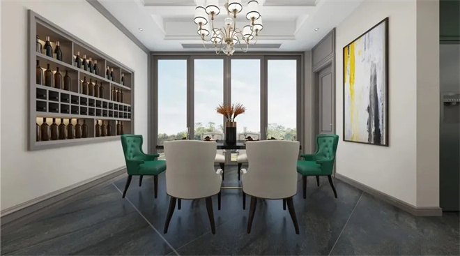餐廳布局排列有序,用金屬質(zhì)感等元素來提升空間的奢華,這里不只是生活用餐的需要,還是家人交流之地。跳躍綠色餐椅,搭配古典特色的吊燈,給空間帶來視覺上的層次感,明亮黃色裝飾畫活躍氣氛,讓用餐變成一件愉快卻又優(yōu)雅的事。