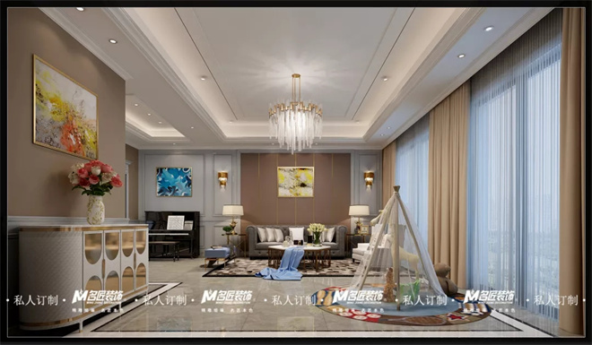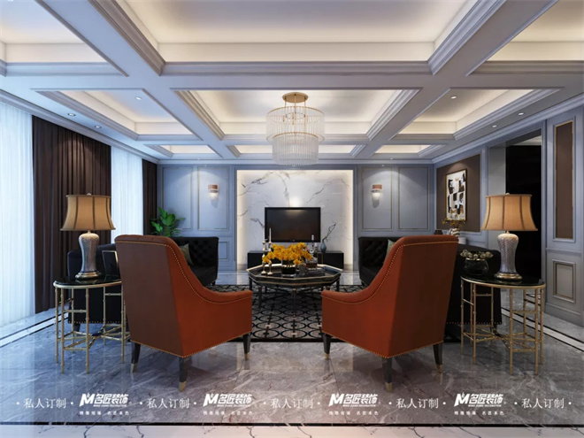 客廳圍繞美式輕奢風(fēng)格,突出都市、時(shí)尚、小資的氛圍打造,不同于傳統(tǒng)美式,更強(qiáng)調(diào)輕奢的格調(diào)。
