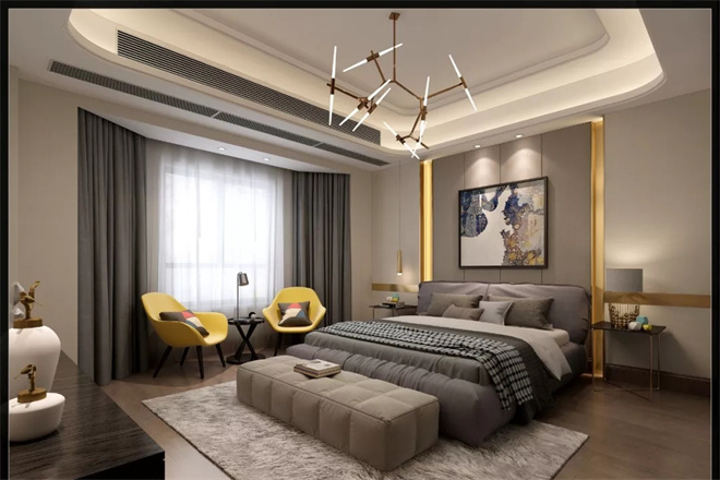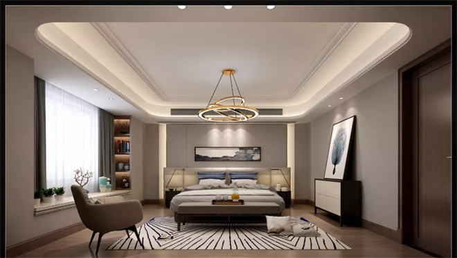 床頭背景墻上配以水墨畫,讓整個(gè)臥室呈現(xiàn)出一種簡(jiǎn)單的知性美。