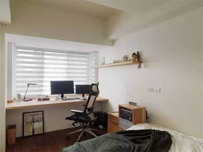 臥室的窗臺(tái)下,一個(gè)木質(zhì)擱板就成為簡(jiǎn)單的書桌,這種做法比放一個(gè)現(xiàn)成的桌子更加節(jié)省空間