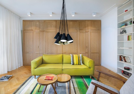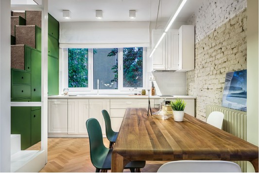 這是一間位于保加利亞的公寓,從結(jié)構(gòu)、模式甚至是顏色來(lái)看,這間公寓似乎比較單調(diào),很難找到出彩之處??蛷d里,最搶眼的也只不過(guò)是一張青綠色的普通沙發(fā),還有一"盞"頗具創(chuàng)意的吊燈。整個(gè)空間色調(diào)都是綠自搭配,綠色給人清新舒暢的感覺(jué),而白色則像純真潔凈的微笑那般干凈。其實(shí),公寓是一個(gè)開(kāi)放性的大房間,沒(méi)有門(mén)或者隔板,卻把每個(gè)空間都劃分完整;綠色的閣樓樓梯,看似是—個(gè)個(gè)收納柜,但設(shè)計(jì)師把廚房的電器都藏在樓梯柜里,省略了空間位置,又美觀實(shí)用;更隱秘的是,在卡其色書(shū)柜的后面是一個(gè)書(shū)房,而白色書(shū)柜后面則是一個(gè)單獨(dú)的臥室。空間簡(jiǎn)而不單,打破常規(guī)設(shè)計(jì),結(jié)合空間的地理特點(diǎn),給平凡的生活制造點(diǎn)驚喜。
